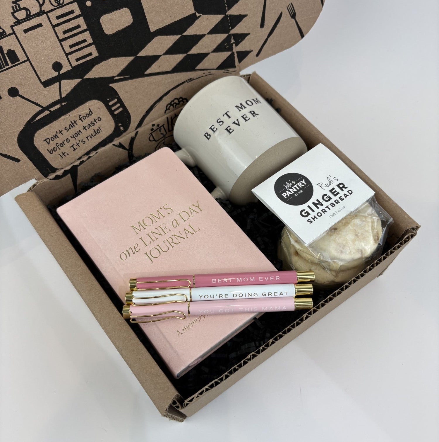 Celebrate Mom with this thoughtfully curated box. Inside, she'll find a beautifully crafted journal, inspirational pens, delicious shortbread cookies for a sweet treat, and a charming mug perfect for her favorite morning beverage. Let Mom know how deeply loved and appreciated she is this Mother's Day.